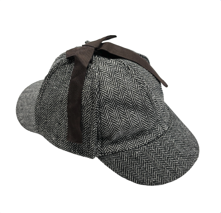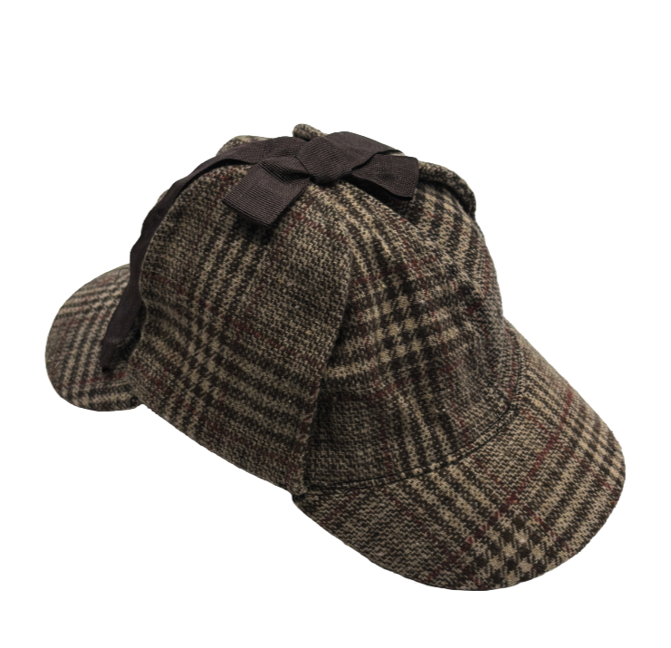 A compact Sherlock Holmes-style deerstalker with functional ear covers. Perfect for theater or costume wear.