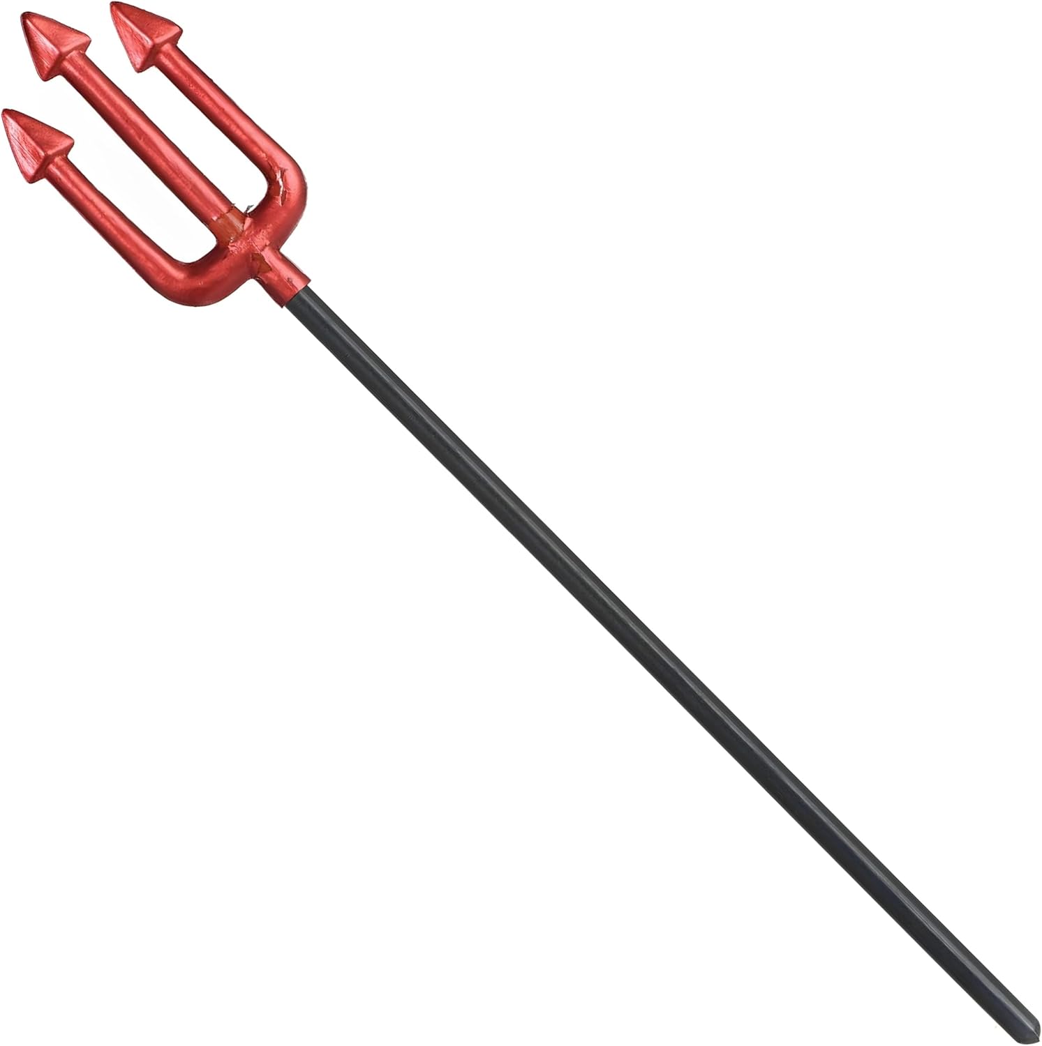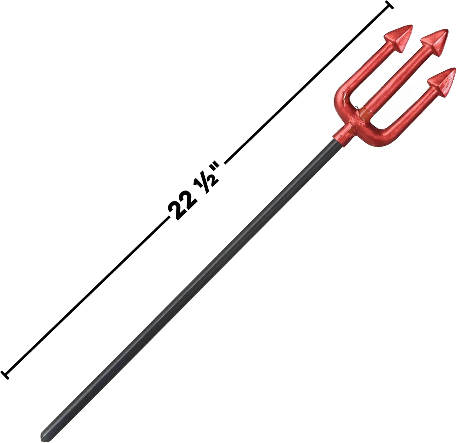 Lightweight plastic pitchfork prop in striking metallic red. Perfect for devil costumes, theatrical productions, or Halloween displays. Measures 22.5" tall for easy handling and storage.