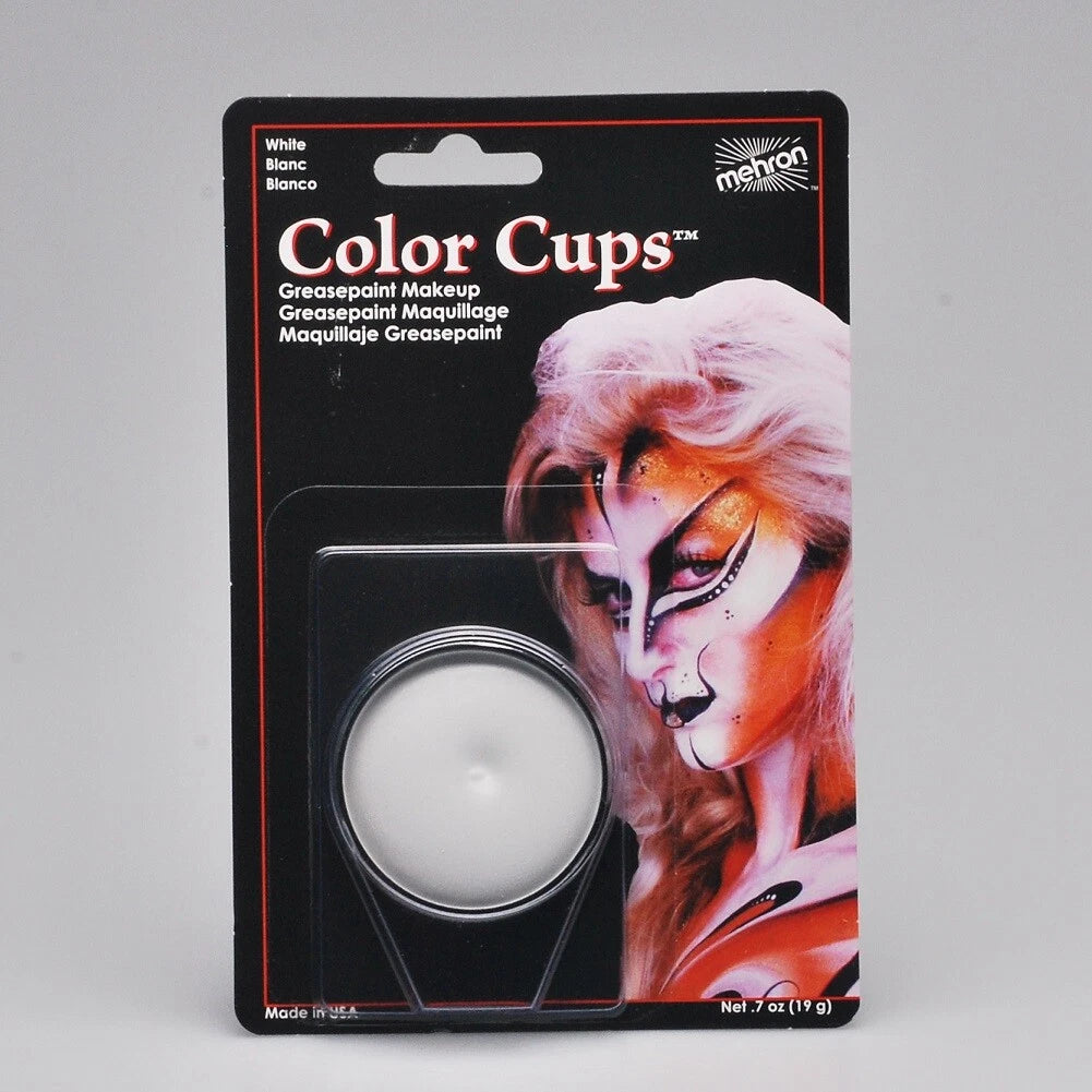 White plastic color cup by Mehron for costume and theatrical makeup application. Ideal for blending, storing, and dispensing makeup products. Lightweight and reusable with a fitted lid to keep contents secure and protected.